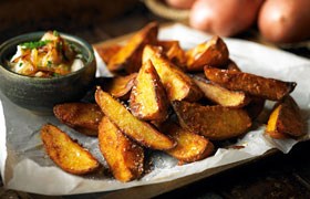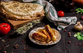 Potato wedges, menemen, grilled sujuk, sigara borek, grilled halloumi cheese, grilled mushroom with cheese, tomato, and pepper.