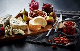 Assorted cheese and breakfast salad plate, olives, homemade jams, honey, butter cream, tahina molasses mix, grilled halloumi...