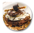 Banana, chocolate and caramel ice creams with banana slices, cornet pieces, ground pistachio & hazelnut, caramel sauce and décor chocolate on top
